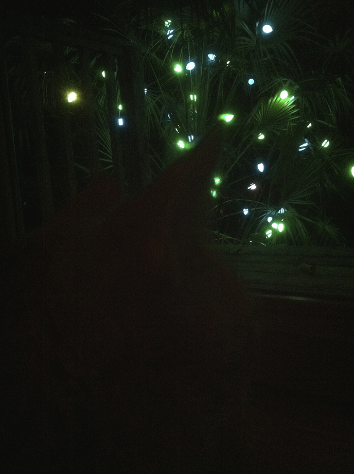 Image: A maze of lights in the darkness, last Christmas, out the front door. Can you discern the kitty ears? Haden was looking out the window when I took that photo.