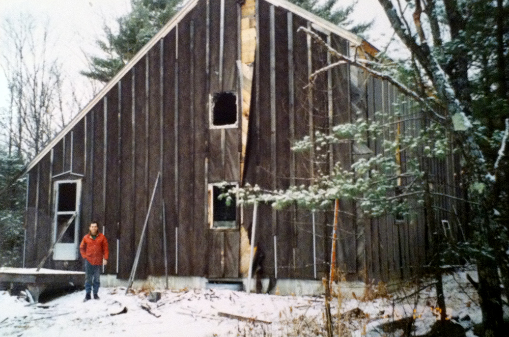 When Seth and I were spending summers here, it was pretty rustic. The shell of the building was complete, but the exterior was wrapped in tar paper. There were windows but the interior walls were just beginning to be framed, so we could see each other from clear across the house. Our water came from a hose that Seth ran from outside up to the second floor, the water running into an old elongated cast iron sink, draining out the side of the house through a pipe into the woods below. Our lights were mostly Christmas lights, strung up along the wall studs. Each summer we added more luxuries: a reading lamp, a rice steamer, a toaster oven, an old Philco radio that got louder as the tubes inside warmed up. We heated up water on an electric burner for shaving in a basin with an old mirror that had just a bit of silver reflection left in it. It was hung from a nail in one of the wall studs on the opposite side of our little kitchen table that might fit three people at most, and there were times when we did fit three. We had Brother Arnold over once for dinner. And dinners were usually pretty damn good. We’d make things like fried squash blossoms, harvesting the vegetables from the huge garden Seth planted near his parents’ home, which was a hundred yards away through the woods. We got really good at working within limitations. Each year we took to heart the words summertime and the living is easy. We made it so with what little we had and, to be honest, the living was pretty great.
